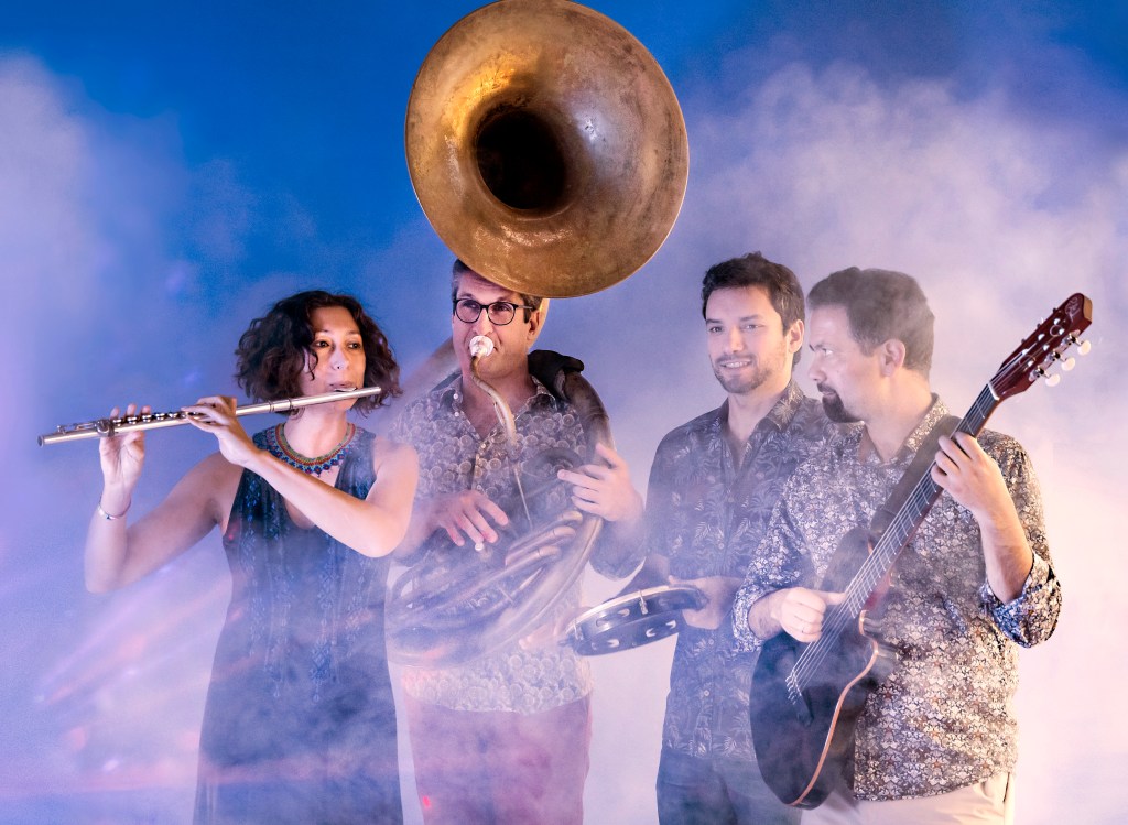 Ce quartet à géométrie variable se distingue par une instrumentation originale qui associe les timbres des flûtes d’Amina à ceux du sousaphone de Fabien Debellefontaine , de la guitare de Yoan Fernandez et des multiples percussions de Jonathan Edo.